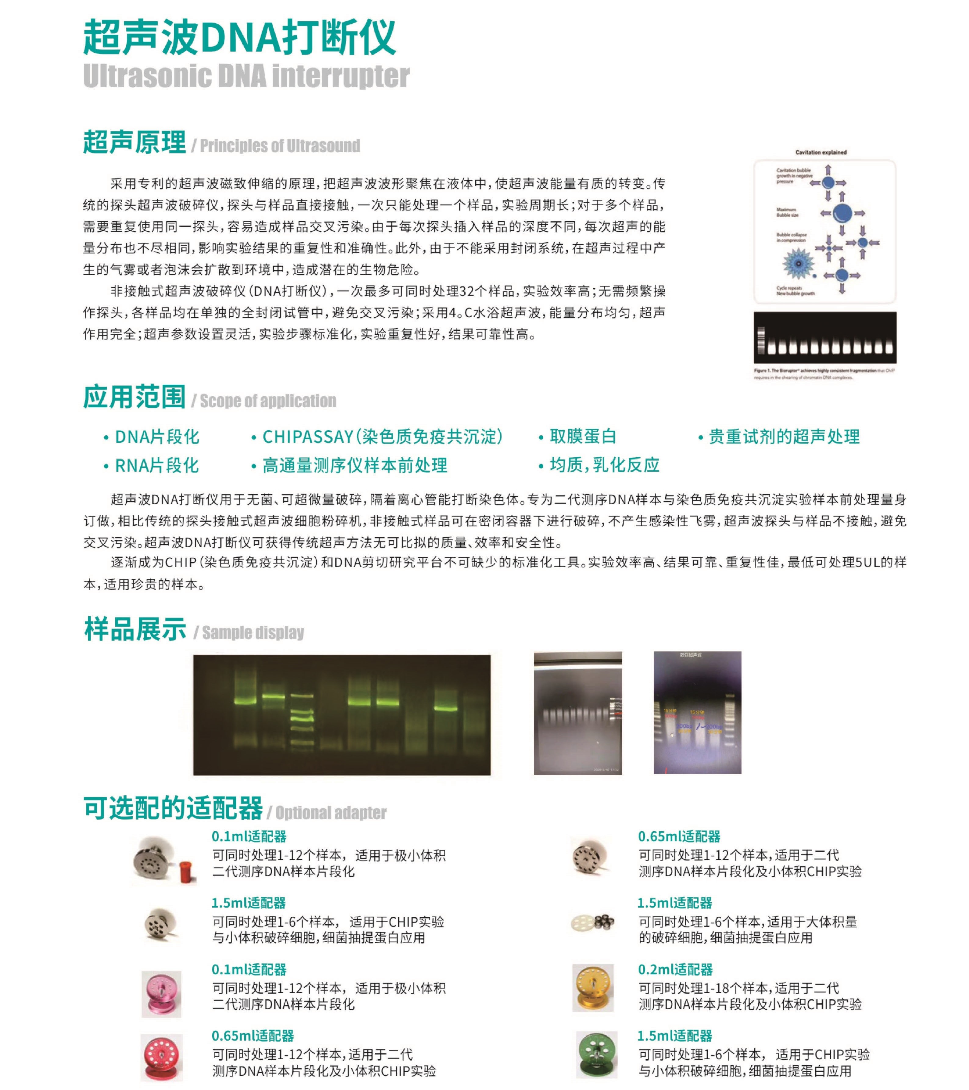 簡(jiǎn)要描述:超聲波RNA/DNA打斷儀用于無(wú)菌、可超微量破碎,隔著離心管能打斷染色體。專(zhuān)為二代測(cè)序 DNA 樣本與染色質(zhì)免疫共沉淀實(shí)驗(yàn)樣本前處理量身訂做,相比傳統(tǒng)的探頭接觸式超聲波細(xì)胞粉碎機(jī),非接觸式樣品可在密閉容器下進(jìn)行破碎,不產(chǎn)生感染性飛霧,超聲波探頭與樣品不接觸,避免交叉污染。超聲波 DNA 打斷儀可獲得傳統(tǒng)超聲質(zhì)量、效率和安全性。逐漸成為ChIP(染色質(zhì)免疫共沉淀)和 DNA 剪切研究平臺(tái)不可缺少的標(biāo)準(zhǔn)化工具。實(shí)驗(yàn)效率高、結(jié)果可靠、重復(fù)性佳,低可處理 5ul 的樣本,適用珍貴的樣本。